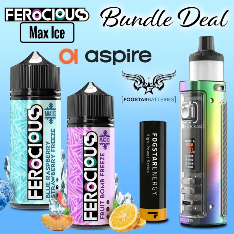 You receive the Aspire Veynom EX kit plus a 100 ml bottle of Ferocious Max Ice 50/50 Collection e-Liquid and a Fogstar Energy 3000 mAh 18650 battery — both free.