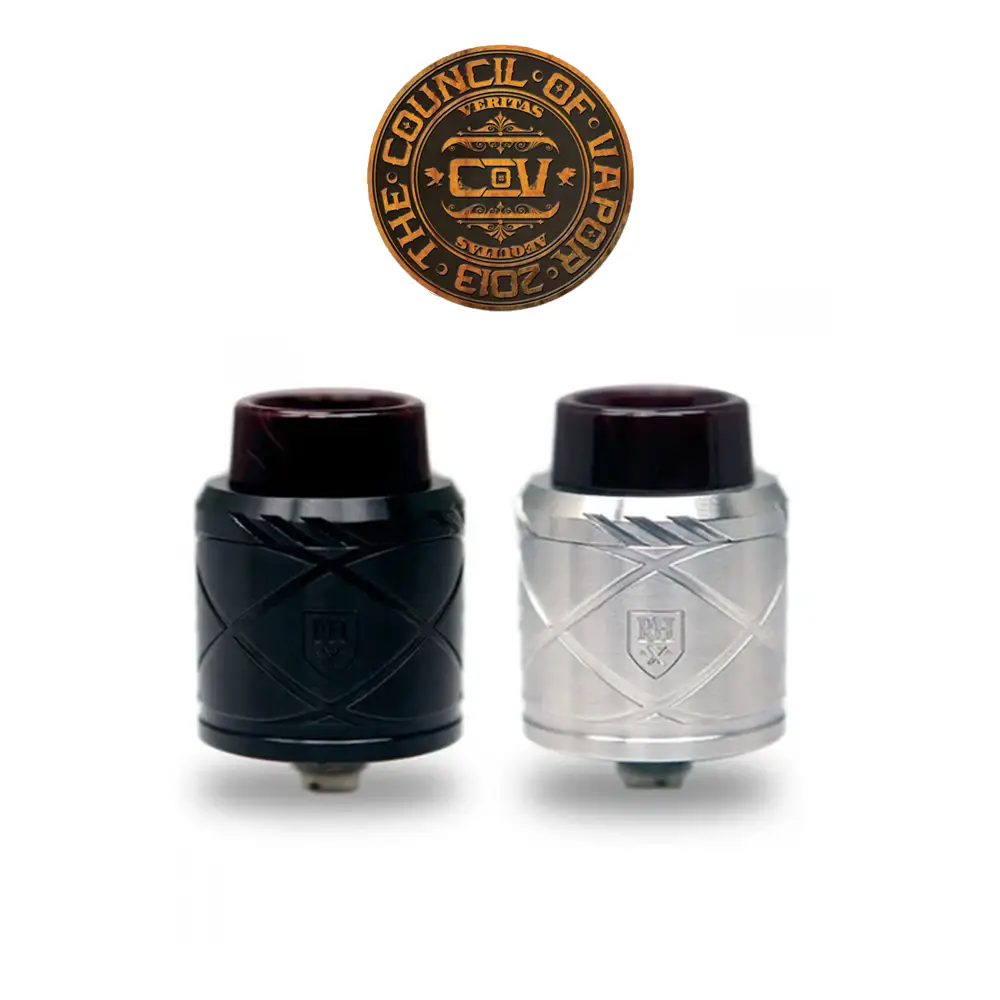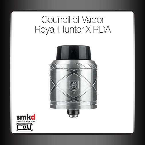Council Of Vapor Royal Hunter X RDA is advanced reinvention of the Royal Hunter Legacy, The latest and up to date intuitive build deck design is introduced featuring a two-post designs with dual terminals on each post as well as staple clamps mechanism. It is reshaped and re-featuring royal hunter from royal hunter mini, with a deep engraving it delvers a beautifully crafted sleeve to present a eye-catching showcase piece and standout among the top ecig device of today’s. The sleeves are changeable and multiple colors are available. The chassis is more impressive and stylistic. The unit is truly versatile with integration of staple clamps mechanism. Build deck achieves the Pioneer, combining the tried-and-true two-post with dual terminals per post which results of securing coil leads through the four terminal openings. For cooling properties and extra heat resistance it included ultra widebore drip tip, when paired with an controllable airflow system that features three parallel positioned openings on each side. With truly versatile design and dedicated craftsmanship it is manufactured by well known industry, the Royal Hunter X RDA model features sought after by every enthusiast and advanced builder.