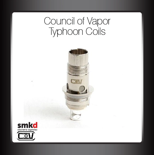 Replacement Coil/Atomiser Head for The Council of Vapor Typhoon tanks Available as single coils in 0.5 ohm or 1.5 ohm resistance The coils come individually wrapped in sealed clear plastic.