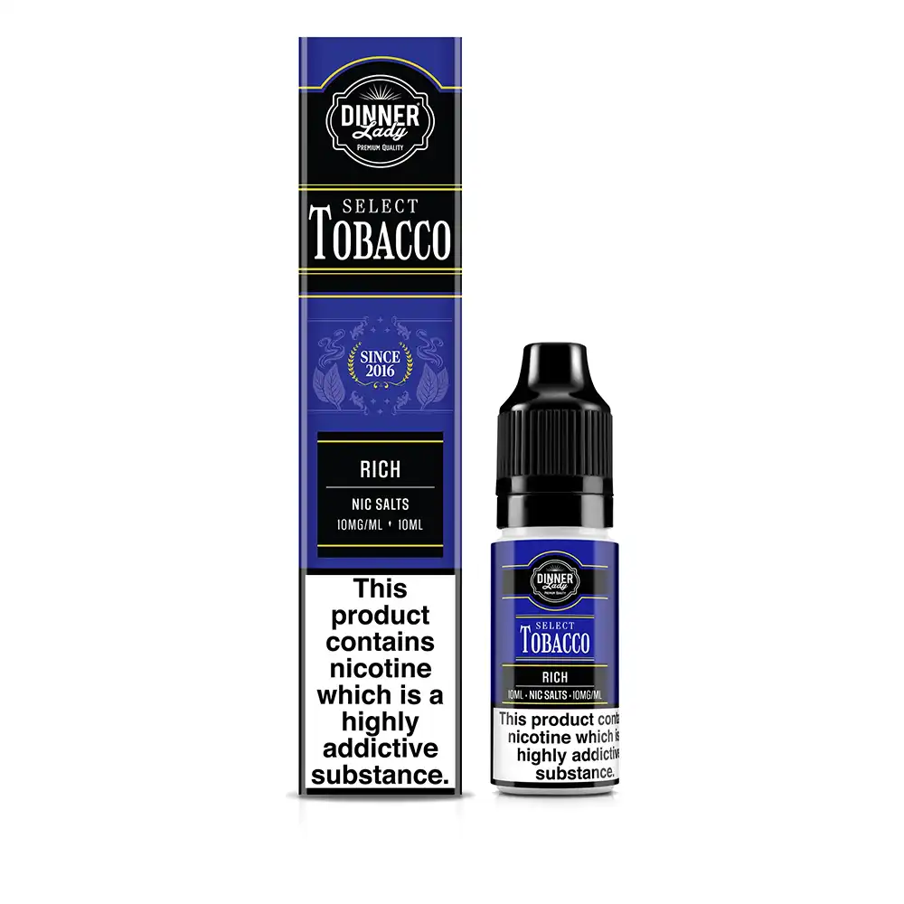 Dinner Lady Bar Salts Select Tobacco Range is a premium collection of nicotine salt e-liquids developed to replicate the traditional smoking experience for adult users looking to quit or reduce cigarette use. Each blend is formulated with nicotine salts derived from tobacco leaves, creating a smooth throat hit, rapid nicotine absorption, and bold flavour delivery at both 10mg and 20mg strengths.