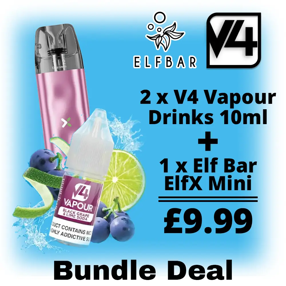 This bundle includes one Elf Bar ELFX Pod Kit and two 10ml e-liquids from the V4 Vapour Drinks range.