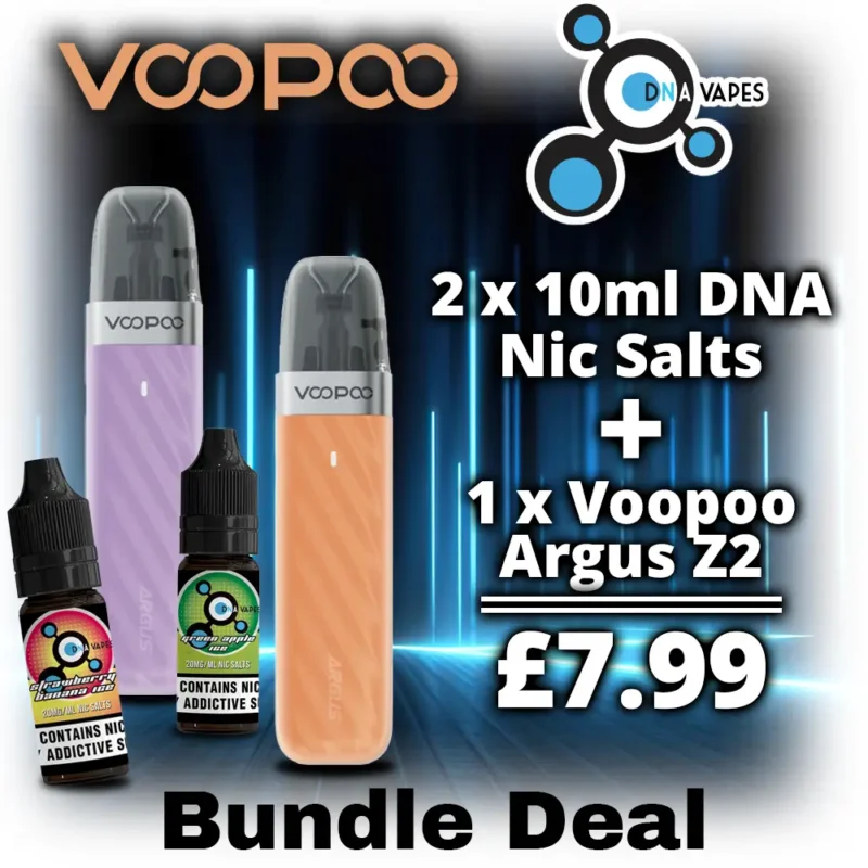 This bundle includes one Voopoo Argus Z2 pod kit and two DNA Vapes 10ml nicotine salt e-liquids.